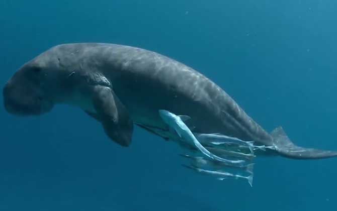 3、繁殖:儒艮是哺乳动物,雌性9~10年、雄性7~9年可达性成熟,几乎一年四季都可繁殖,妊娠期11~14个月,雌性前后两次产仔间隔3~7年,哺乳期长达18个月。