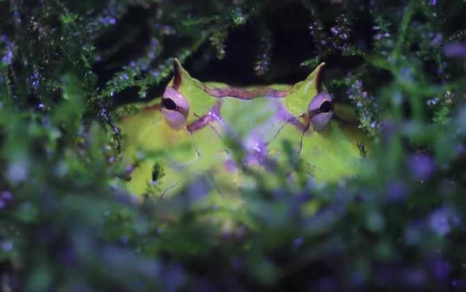 2、食性:角蛙是肉食性动物,主要以昆虫、鸟类、其他蛙类等为食,在陆地上使用舌头捕猎,在水中可直接用下颌捕捉猎物。