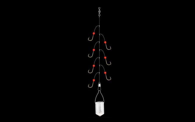 七星钩是一种特殊的钓组,别称七星串钩、白金串钩、花篮串钩等,这种钓组将串钩和拟饵钩完美的结合在一起,通常由7枚(有些是5枚或9枚)配有荧光珠的袖钩和诱饵笼组成,作钓时诱饵笼中装饵料抛入钓点,拖动钩组吸引白条、马口等中上层鱼类吞食。