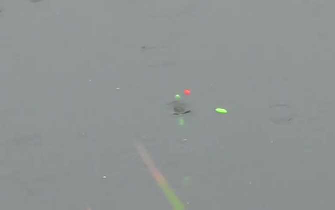 2、带钩调漂:调漂时先重铅找底,然后下拉浮漂半水调平水至2目,将铅坠上方太空豆松开10厘米,挂上饵料后钓2~3目即可。