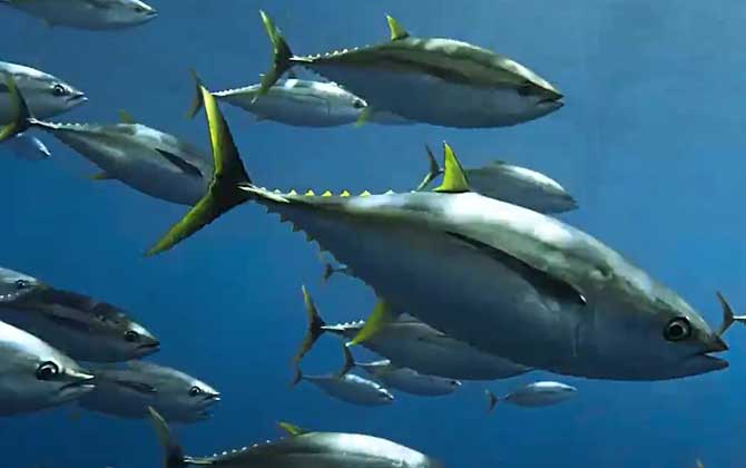 2、食性:金枪鱼是肉食鱼类,摄食凶猛,主要以鲭鱼、鲐鱼、鲱鱼、沙丁鱼等鱼类和鱿鱼、乌贼、章鱼等头足类为食,也摄食螃蟹、虾类等甲壳类动物及其他海洋无脊椎动物。